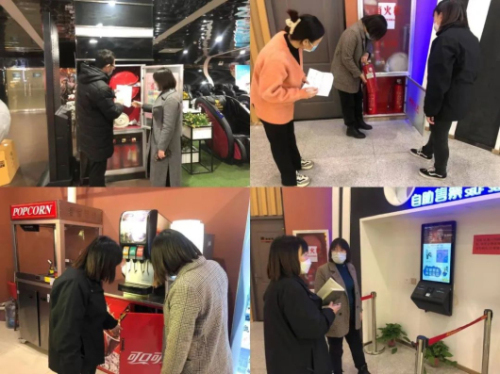 在金棕櫚東尚國際影城,工作組重點對影城的消防器材使用及維護(hù),消防安全記錄,前臺賣品設(shè)備使用,自助售票機(jī)使用情況進(jìn)行了檢查,并對影城安裝的測溫設(shè)備和自助檢票閘機(jī)設(shè)備進(jìn)行測試,確保在落實防疫措施的同時,觀眾可以快速檢票入場,保證觀影安全。