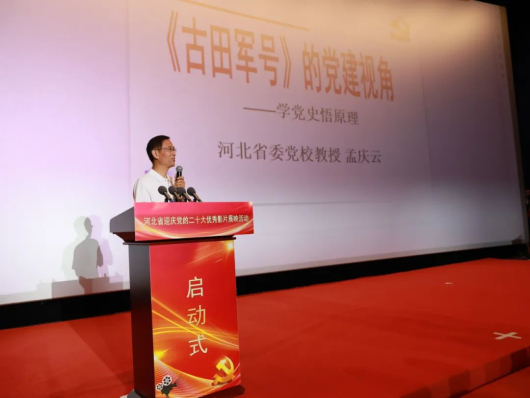 在啟動式上,專門請到了河北省委黨校副校長孟慶云為大家講述了首場放映影片《古田軍號》的歷史背景,為觀眾上了一堂生動的電影微黨課。