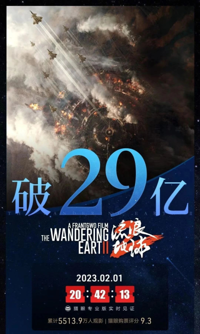 春節(jié)檔影片持續(xù)熱映。據(jù)貓眼專業(yè)版數(shù)據(jù)顯示,截至2月2日,電影《流浪地球2》累計票房突破29億元,觀影人次超5600萬。2019年,電影《流浪地球》創(chuàng)下46.87億元票房,在千千萬萬觀眾心中種下了科幻的種子。2023年,《流浪地球2》讓科幻的種子發(fā)芽,影迷們再度感受到中國科幻電影的巨大魅力。