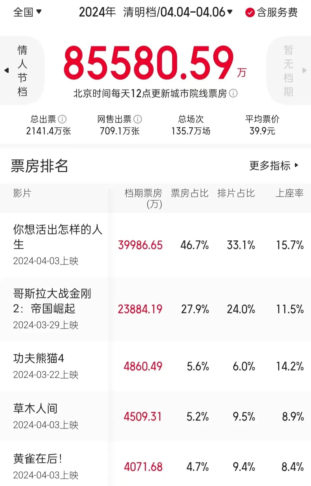電影《你想活出怎樣的人生》檔期票房近4億元,領(lǐng)跑清明檔。《哥斯拉大戰(zhàn)金剛2:帝國崛起》檔期票房破2.3億元,排名第二。《功夫熊貓4》、《草木人間》和《黃雀在后!》分別以超4800萬元、4500萬元、4000萬元的票房成績位列清明檔第三、四、五位。新老作品加持下,電影市場紅紅火火。