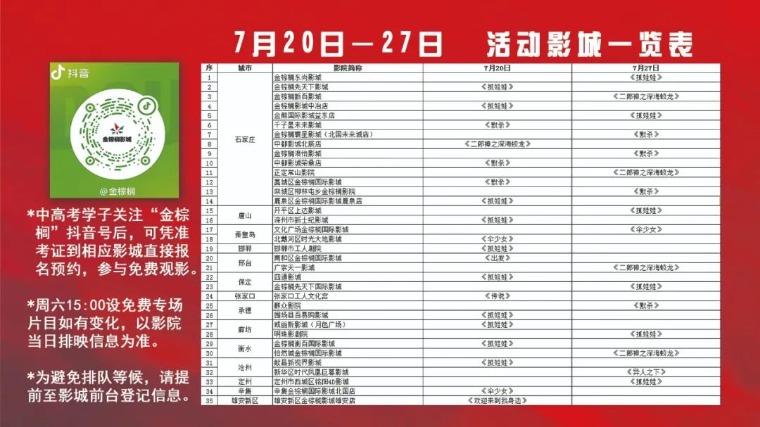 省內(nèi)外中、高考應(yīng)屆畢業(yè)生可持本人準(zhǔn)考證到活動(dòng)影院前臺(tái)登記信息報(bào)名預(yù)約進(jìn)行觀影,或關(guān)注“金棕櫚”官方抖音號(hào),私信上傳本人準(zhǔn)考證照片、手機(jī)號(hào)信息,進(jìn)行預(yù)約,選擇在任意一家參與活動(dòng)的影城免費(fèi)觀影。