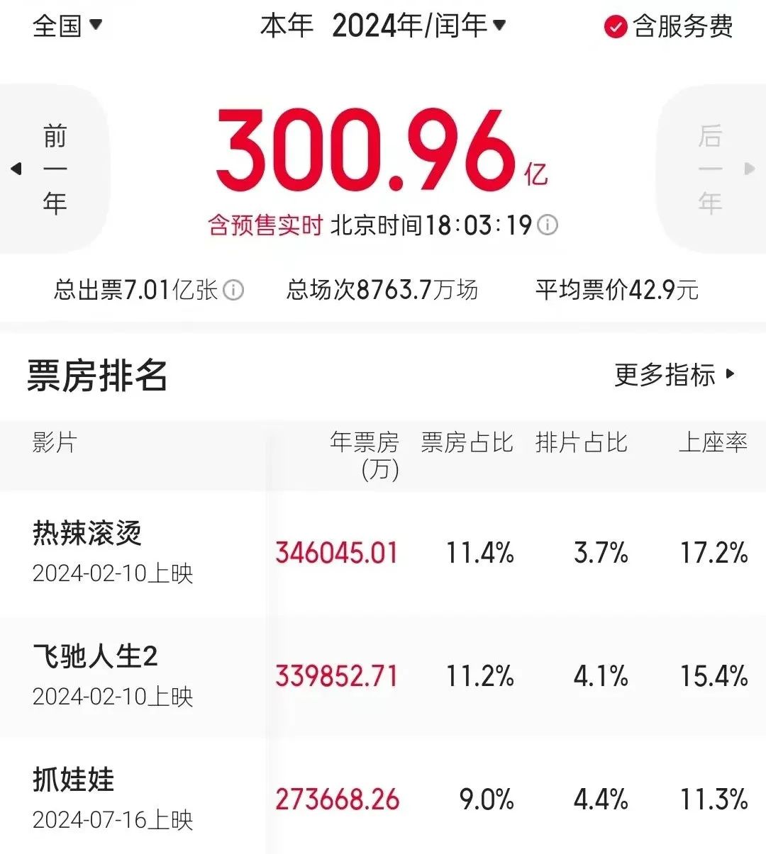 據(jù)貓眼專業(yè)版數(shù)據(jù)顯示,截至目前,2024年全國電影總票房已突破300億元,累計(jì)觀影人次達(dá)7億人。《熱辣滾燙》《飛馳人生2》《抓娃娃》分別以34.6億元、33.9億元、27.3億元的票房成績暫居年度票房榜前三名。