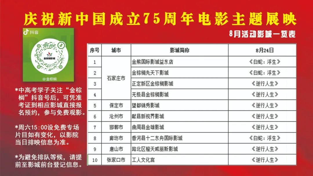 省內(nèi)外中高考應(yīng)屆畢業(yè)生關(guān)注“金棕櫚”官方抖音號(hào)后,可持本人準(zhǔn)考證到活動(dòng)影院前臺(tái)登記信息、報(bào)名預(yù)約后,進(jìn)行免費(fèi)觀影。